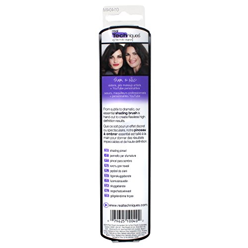 -. Binding : Health and Beauty -. Brand : Real Techniques -. Color : multi/none -. Department : Female -. EAN : 0079625100402 -. Feature : Hand cut hair design allows for even and streak free application of makeup / Synthetic taklon bristles are non-porous and do not trap or absorb product, bacteria and dead skin cells / Bristles are less prone to breakage or damage as well as keep clean and maintain / Uniquely shaped and color coded aluminum ferrule / Online video tutorials at http://www.youtube.com/user/realtechniques -. IsAdultProduct : 0 -. IsAutographed : 0 -. IsMemorabilia : 0 -. Label : Real Techniques -. Manufacturer : Real Techniques -. Model : 1404 -. MPN : RLT-1404 -. NumberOfItems : 1 -. PackageQuantity : 1 -. PartNumber : RLT-1404 -. ProductGroup : Beauty -. ProductTypeName : BEAUTY -. PublicationDate : 2012-11-19 -. Publisher : Real Techniques -. Studio : Real Techniques -. Title : Real Techniques Shading Brush, 1.6 Ounce -. UPC : 604100679991