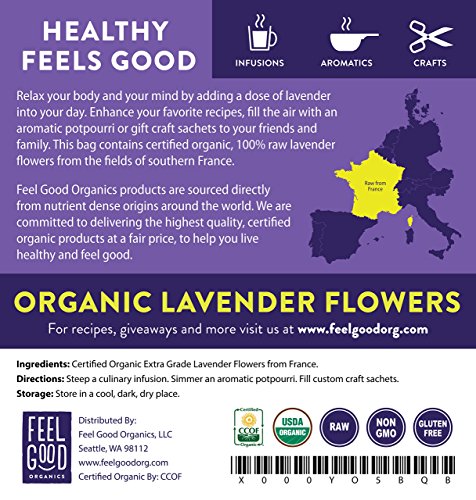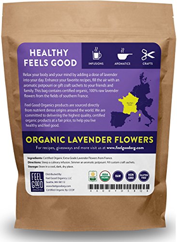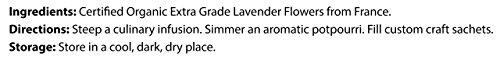 Certified USDA Organic Lavender Flowers (Extra Grade - Lavandula angustifolia)Relax your body and your mind by adding a dose of lavender into your day. Enhance your favorite recipes, fill the air with an aromatic potpourri or gift craft sachets to your friends and family. Steep a culinary infusion. Simmer an aromatic potpourri. Fill custom craft sachets. This resealable bag contains 16 ounces (1 pound) of certified organic, 100% raw lavender flowers from the fields of southern France.