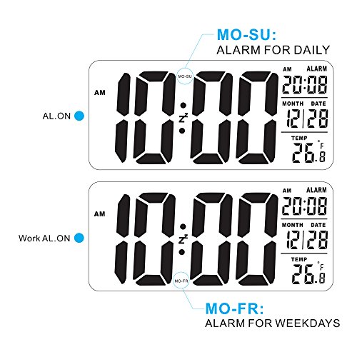 Time (12/24), Date(MM/DD), Temp (C/F), Alarm (MO-FR/ MO-SU, ON/OFF). Ascending Alarm. Touch-activated 5-minute Snooze. Easy to turn off alarm