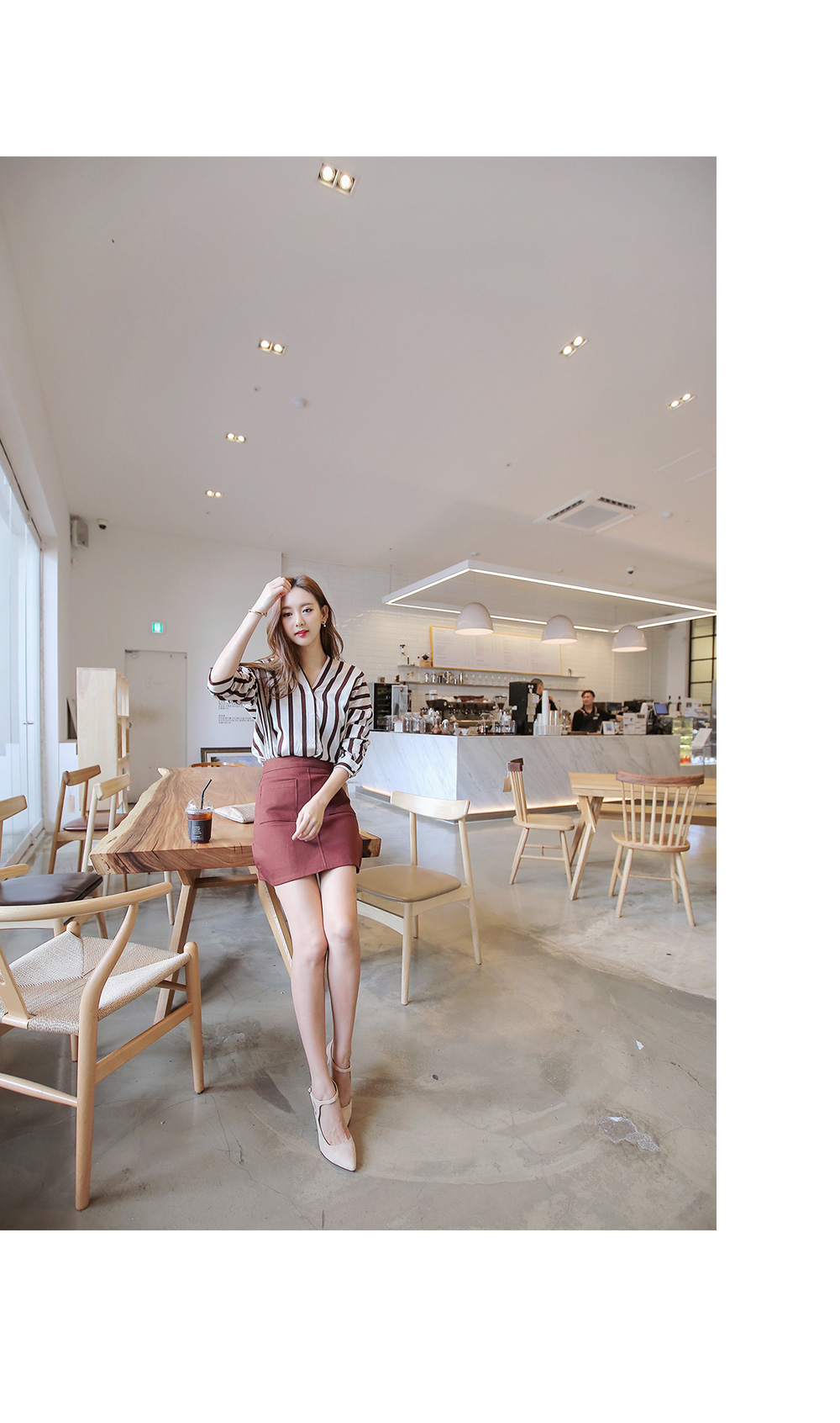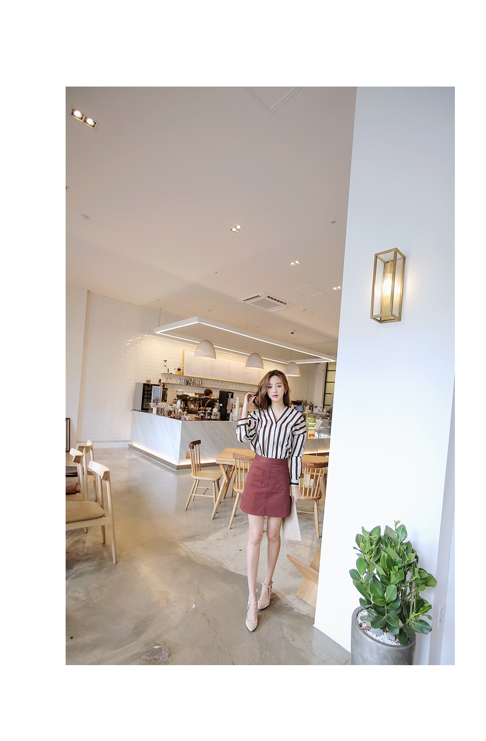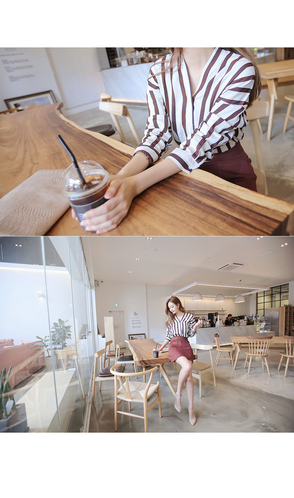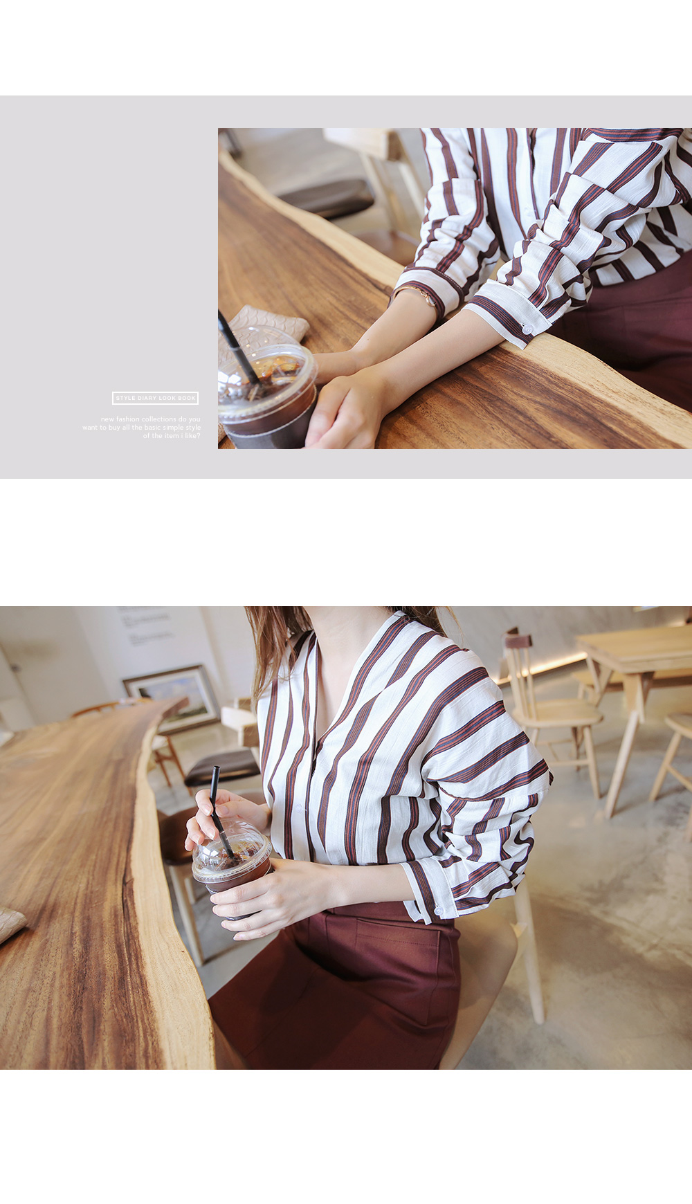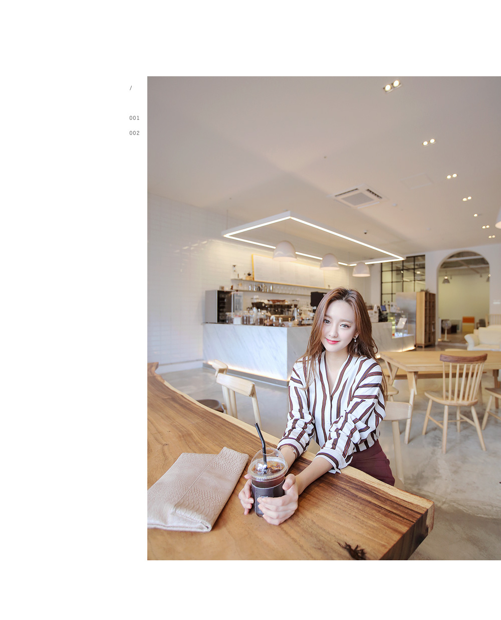 고급스러운 무드의 줄지 브이넥 셔츠를 소개합니다.
