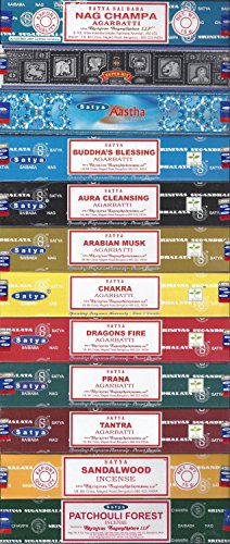 Satya Set of 12 Nag Champa, Super Hit, Aastha, Buddha Blessing, Aura Cleansing, Arabian Musk, Chakra, Drag
