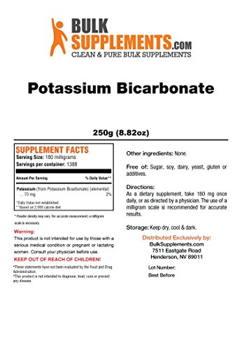 Studio : BulkSupplements Publisher : BulkSupplements Binding : Health and Beauty Product Description Potassium bicarbonate is a form of potassium that benefits heart, digestive, and muscular function. It helps regulate the body's pH balance and may also help relieve symptoms of potassium deficiency, such as muscle cramps, fatigue, and constipation. It is also used in the food industry as a buffering agent, in farming to neutralize acidic soil and prevent mildew growth, and as a fire suppression agent. 0