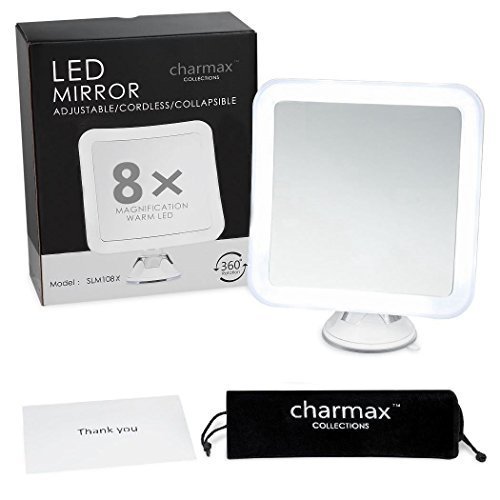 Charmax 8x Magnifying Lighted Makeup Mirror With Bag, Natural LED Lights Bathroom Vanity Mirror, Battery Operated Travel Mirror, Square