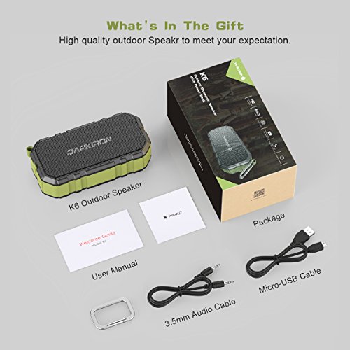 Package Contents: Darkiron K6 Outdoor Speaker, Micro-USB Cable, 3.5mm Audio Cable, User Manual, Under 8 months Warranty and Friendly Customer Service. If you have any problems, please don't hesitate to contact us.