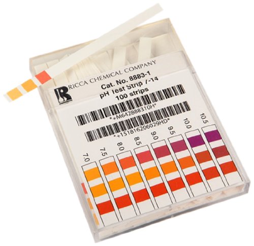-. Binding : Misc. -. Brand : Ricca Chemical -. Feature : Single-use test strips for measuring pH from 7-14 / Indicator is fixed to the test pads to help prevent dye from bleeding into the sample / Includes color chart for matching color and position of the test pads / Long plastic handle reduces contact with the sample / Pack of 100 -. IsAdultProduct : 0 -. Label : Ricca Chemical -. Manufacturer : Ricca Chemical -. MPN : 8883-1 -. NumberOfItems : 1 -. PackageQuantity : 1 -. PartNumber : 8883-1 -. ProductGroup : BISS -. ProductTypeName : LAB_SUPPLY -. Publisher : Ricca Chemical -. Studio : Ricca Chemical -. Title : Ricca Chemical 8883-1 pH Test Strips, 7-14, 1E Container (Pack of 100)