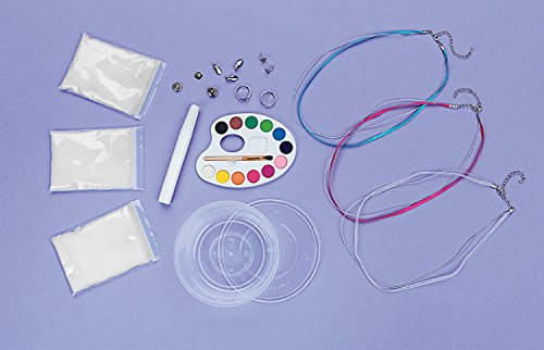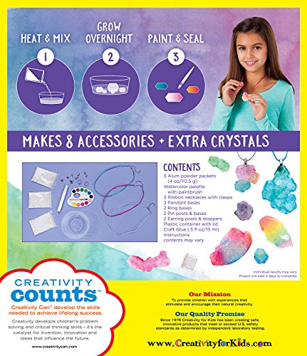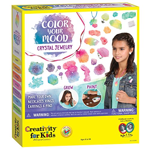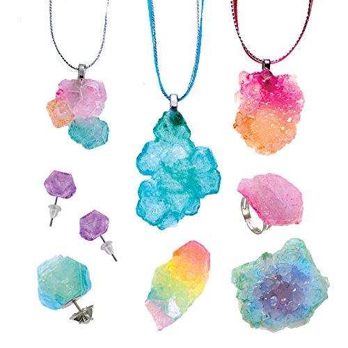 Grow, paint and wear custom made crystals to reflect your mood! Paint your newly formed crystals and turn them into beautiful jewelry pieces that reflect your individuality. Kit includes findings for 3 necklaces, 2 rings, 2 pins and a pair of earrings - plus have extra crystals to spare! Grow 6+ large or 15+ small to medium crystals overnight with alum powder (112.5 grams included). Paint your crystals with water colors that are easily blend-able and can reflect your mood. Not satisfied with the size or shape of your crystal? Just start over! Easily re-use the crystals by placing them back in the microwave, dissolving and starting over. Make your own jewelry or give as gifts to your friends! Great for ages 8 to 98.Feature