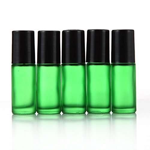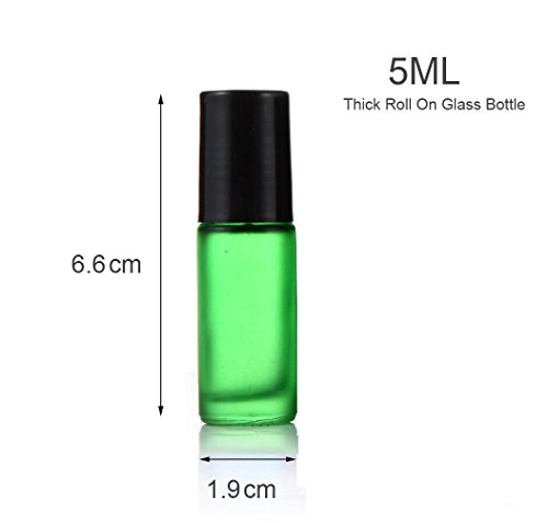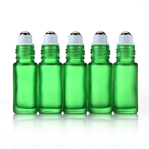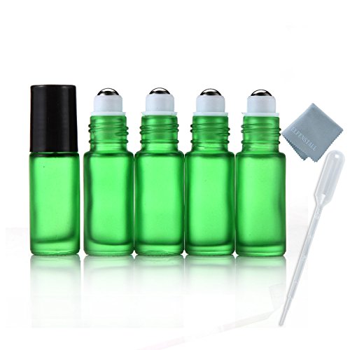 Elfenstall- 5pcs Thick 5ml(1/6oz) Roll on Glass Bottle Frosted green for Essential Oil Empty Aromatherapy Perfume Bottle - Refillable w/ Stainless Steel Roller Ball 3ml Pipette dropper