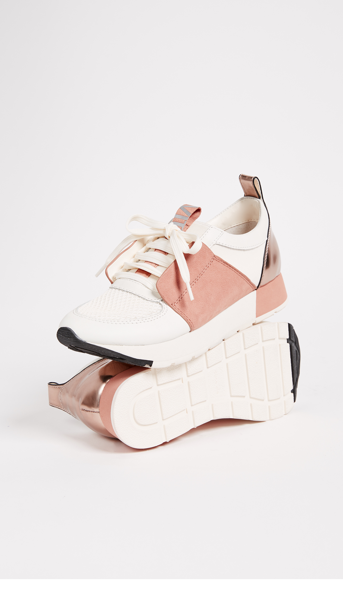 Retro-inspired Dolce Vita sneakers crafted in colorblock leather and breathable mesh. An inset lace-up closure covers the elastic front. Pull tab at the metallic heel cap. Two-tone foam platform. Rubber sole.