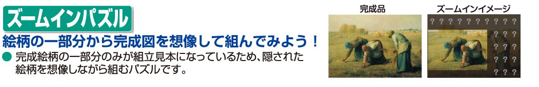 "Masterpiece" series of 450 piece small size (finished size is 300 pieces), which is smaller than the usual puzzle, this "puzzle" is a "zoom in puzzle" where only a part of the finished picture is an assembly sample.