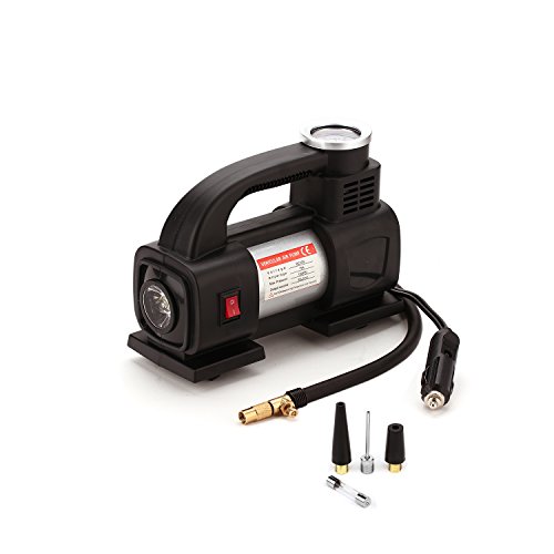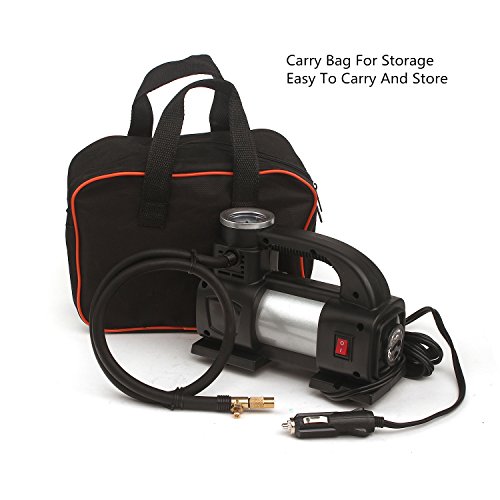 - PACKAGE INCLUDES: Portable Auto Air Compressor, Carry case for storage, 12V DC battery clamps, 2 inflator nozzles and sports needle ,backup fuse