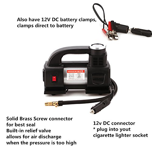 - SIMPLE TO USE - Plug into your 12 Volt cigarette lighter socket, also have 12V DC battery clamps, clamps direct to battery. 2.3-feet rubber air hose and 9.8-feet power cord for a total of 12 feet, makes it extremely easy and hassle-free to reach all vehicle tires