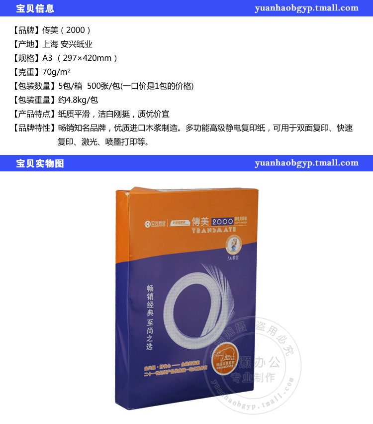 传美复印纸A3 70g 白色复印纸 静电复印纸 全木浆A3纸 500张/包