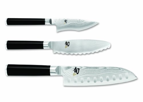 • 3-Piece set of Shun Classic Knives: 4-Inch Paring Knife, 6-Inch Utility Knife and 7-Inch Hollow Ground Santoku Knife
