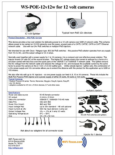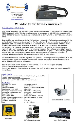 -. Feature : 12 volt 12 watt Power over Ethernet PoE up to 328ft via Ethernet cable / for Foscam, Wansview, Airsight, EasyN, Apexis, Wanscam and other non-PoE devices / Adapters available for 0.7mm, 2.5mm. Click on WiFi-Texas to visit the Amazon Store / Expert, USA Tech support - ask if you have any questions call 512 479 0317