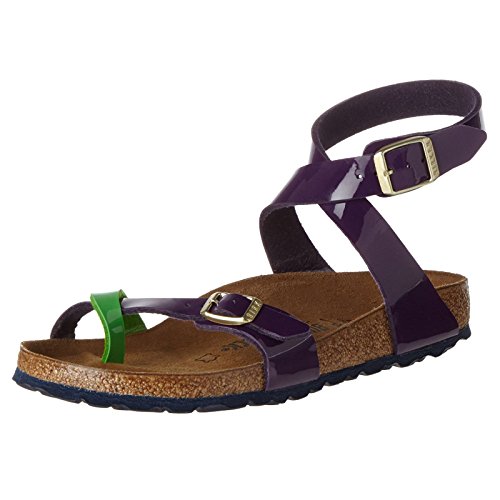 Studio : Birkenstock Publisher : Birkenstock Binding : Apparel Product Description Successfully bridging the gap between the toe-post sandals and the ankle strap, the Yara sandals for women from Birkenstock are a real eye-catcher with the svelte note and minimalist design. These purple and green strappy sandals are manufactured from the exceptionally skin-friendly and hard-wearing synthetic material Birko-Flor with a shiny, patent finish. Birko-Flor is an alternative to leather having the same smooth appearance to which it was added a shiny, patent coating for a touch of extravagance and increased durability. These open back-and-toe sandals feature an adjustable back strap with a gold metal buckle closure that surrounds the ankle in a criss-cross form at the front, a slender strap with gold metal buckle over the instep to adjust to the wearer's feet and an additional loop around the big toe, directly attached to the midsole for a firm grip. The underside of the high quality upper material is lined with exceptionally soft and smooth layer of fleece while the anatomically correct natural cork-latex footbed encourages foot health and makes the Yara sandals a light and summery companion that offers outstanding comfort. The suede lined contoured insole moulds to the shape of your foot creating a custom footbed to cradle and support each and every step you take. The raised toe bar is designed to encourage the natural gripping motion of your feet aiding with circulation. The neutral heel profile and deep heel cup of these slide sandals is distributing your body weight more evenly maintaining a natural posture while walking. Finishing these narrow fit sandals is the flexible EVA outsole which offers lightweight, shock absorbing support with lasting durability. Made in Germany. 0