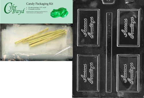 Cybrtrayd "Seasons Greetings" Business Card Chocolate Candy Mold with Packaging Bundle of 25 Cello Bags, 25 Gold Twist Ties and Chocolate Molding Instructions
