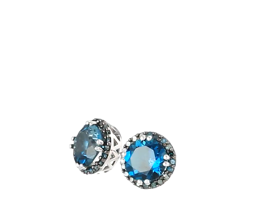 Bestowed with midnight blue charm these 8mm stud earrings featuring prong-set 4.4 cttw 8mm round london blue topaz surrounded by 1.3mm 0.3cctw round blue diamonds are a perfect pair to add instant sparkle to any look.