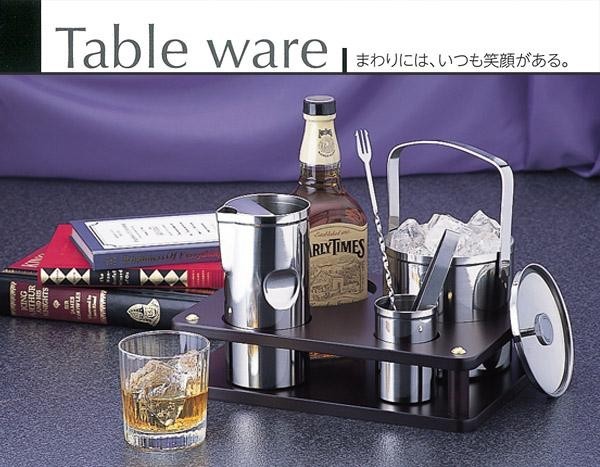 | アイスペール(氷入れ)、ウォーターポット、スタンド・バースプーンがセットになった水割りセットです。直径12cmまでの大きさのお酒のボトルやアイテムがスッキリ収納できる専用の木台付。シンプルで使いやすく、スタイリッシュなデザインで上質なひとときを。 |