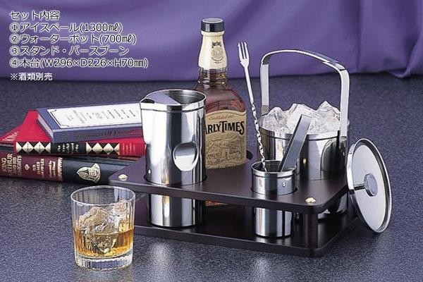 アイスペール(氷入れ)、ウォーターポット、スタンド・バースプーンがセットになった水割りセットです。直径12cmまでの大きさのお酒のボトルやアイテムがスッキリ収納できる専用の木台付。シンプルで使いやすく、スタイリッシュなデザインで上質なひとときを。 |