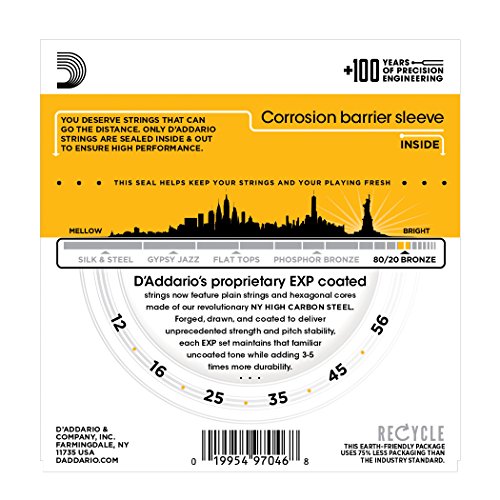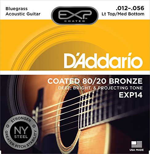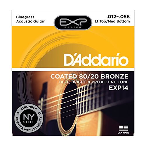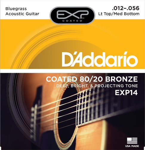 Studio : D'Addario Co. Inc Publisher : D'Addario Co. Inc Binding : Electronics Product Description EXP14, a D'Addario 80/20 Bronze "hybrid" gauge, combines the medium gauge bottom strings for increased resonance and volume with light gauge top strings for more comfortable playability and single note bending. A popular choice for bluegrass pickers.EXPs deliver the most natural-sounding, longest-lasting coated strings available. EXP Coated Technology starts with the highest quality wrap wire materials, precision drawn and micro coated on our advanced proprietary machinery. Strings are then wound normally, delivering tone and feel identical to D'Addario's world renowned acoustic strings, with a minimum of 4 times more life. You won't believe they are coated. D'Addario, the world's largest manufacturer of musical instrument strings, is known as "The Players Choice" with a reputation for unsurpassed quality and consistency. D'Addario's innovative packaging both reduces waste and provides protection from corrosion. All D'Addario strings are manufactured in the U.S.A. using proprietary, digitally controlled, state of the art machinery for unmatched performance, set after set. 0