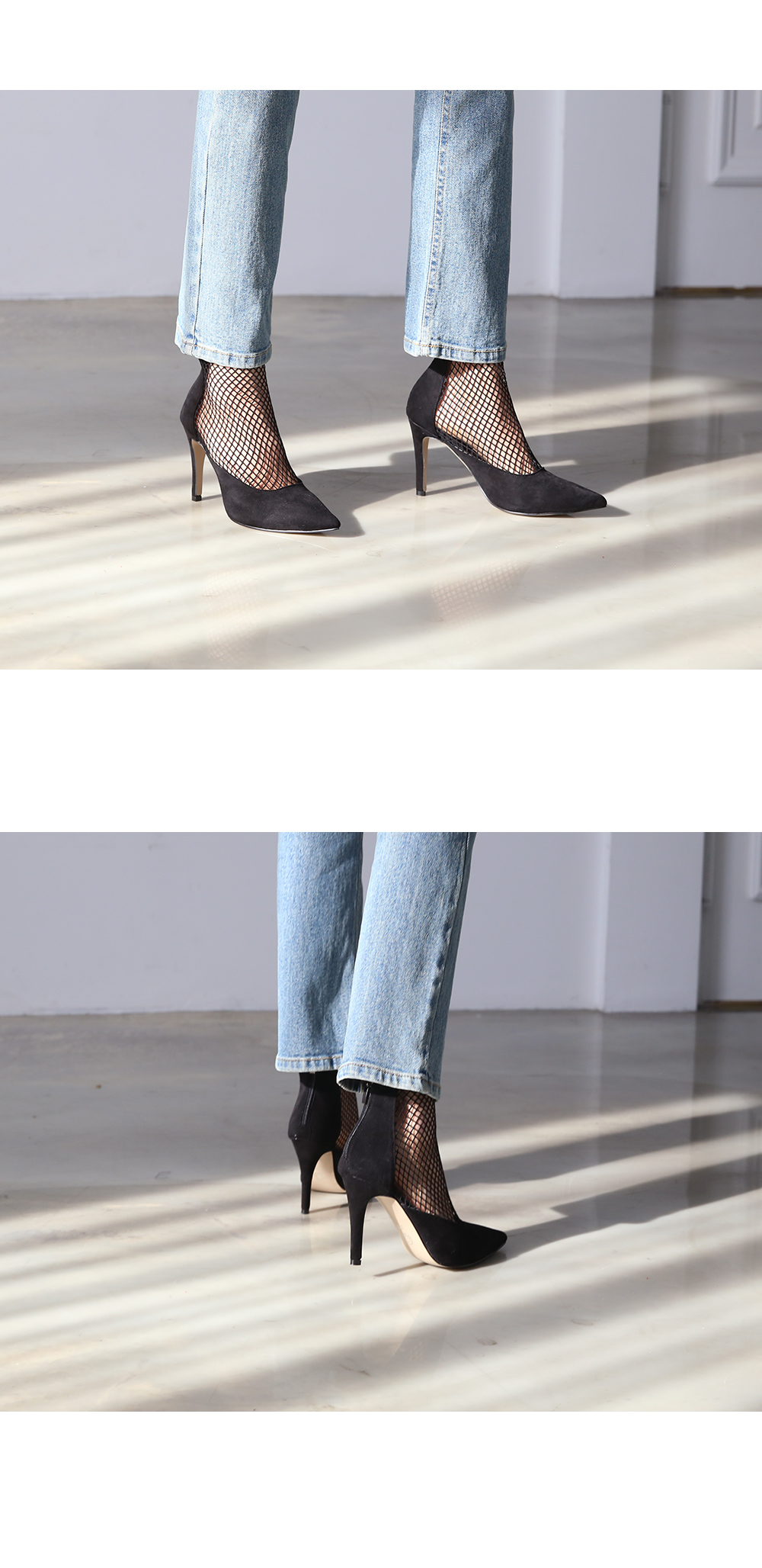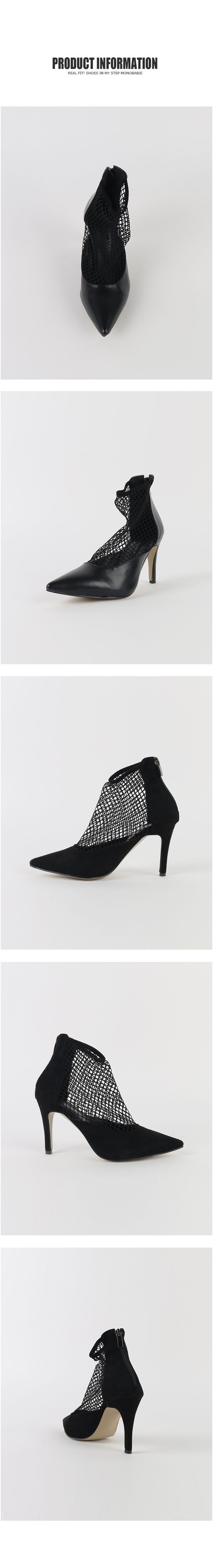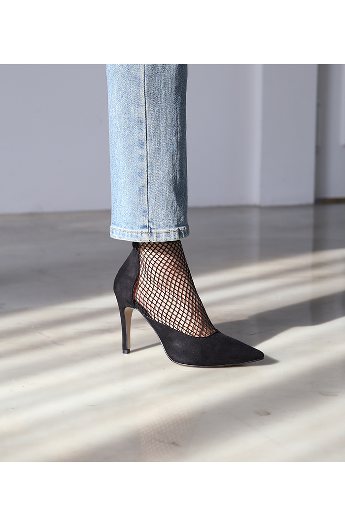 펌프스디자인에 메쉬가 더해져 언뜻 보면 힐에 메쉬삭스 매치한듯한 독특한 무드를 선사합니다.