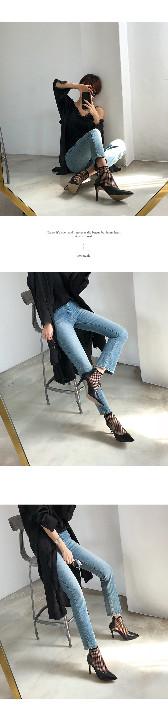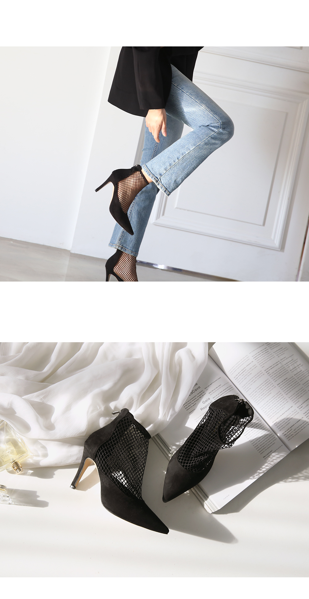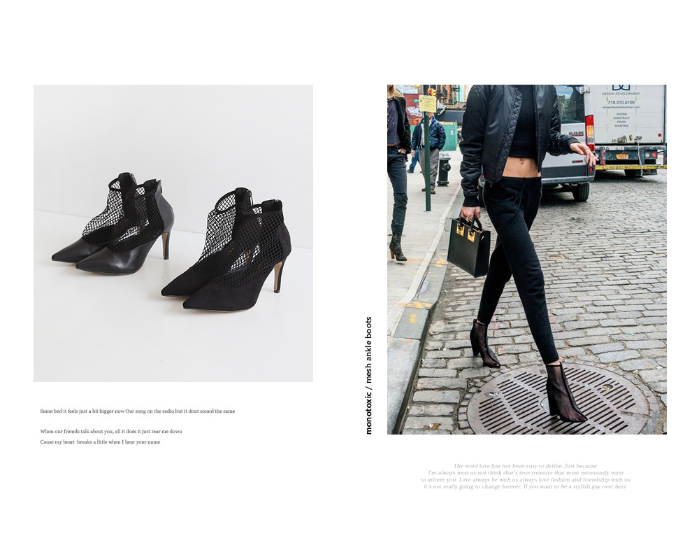 펌프스디자인에 메쉬가 더해져 언뜻 보면 힐에 메쉬삭스 매치한듯한 독특한 무드를 선사합니다.