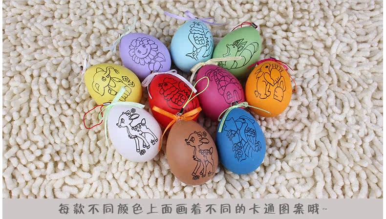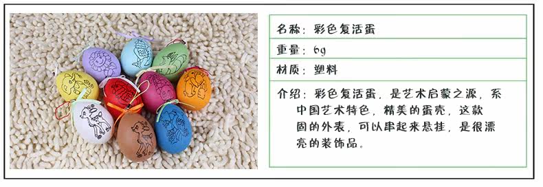 Material: plastic Weight: about 6 grams Introduction: color Easter eggs, is the source of artistic enlightenment, the Department of Chinese art features, exquisite eggshell, this solid appearance, can be strung together to hang, is a very beautiful decoration