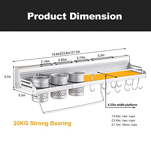 Easy assembly and strong loading: Two ways for install: Screw (Included) or Glue (NOT included) Easy to mount on the wall without need a handyman. Heavy duty yet lightweight main unit with screws ensures maximum weight capacity of 44lbs (20kg). Stylish design and fine workmanship add beauty to the kitchen.