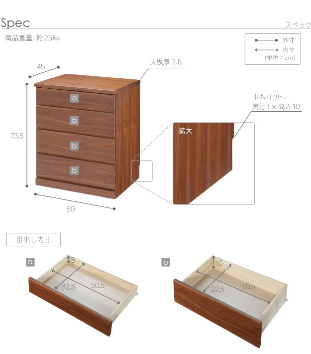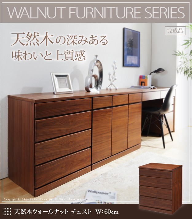 ※メーカー直送のため代金引換はお受けできません。※沖縄・一部離島は別途送料がかかります。お見積もりいたしますのでお問い合わせ下さい。商品について:こだわりの天然木突板を使用したウォールナットチェスト。サイズ感もコンパクトでトータルコーディネイトを楽しめます!引出しはレール付きで開閉がスムーズ☆サイズ(cm):幅60x奥行45x高さ73.5cm・約25kg材質:天板・側板-天然木化粧合板(ウォールナット)、引出し前板-天然木化粧繊維板(ウォールナット)、ウレタン樹脂塗装完成品