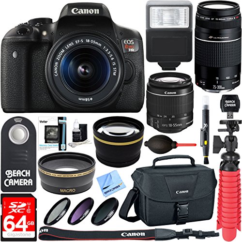 Canon T6i EOS Rebel DSLR Camera w/ EF-S 18-55mm & 75-300mm III Lens Kit + Accessory Bundle 64GB SDXC Memory + SLR Photo Bag + Wide Angle Lens + 2x Telephoto Lens + Flash + Remote + Tripod & More