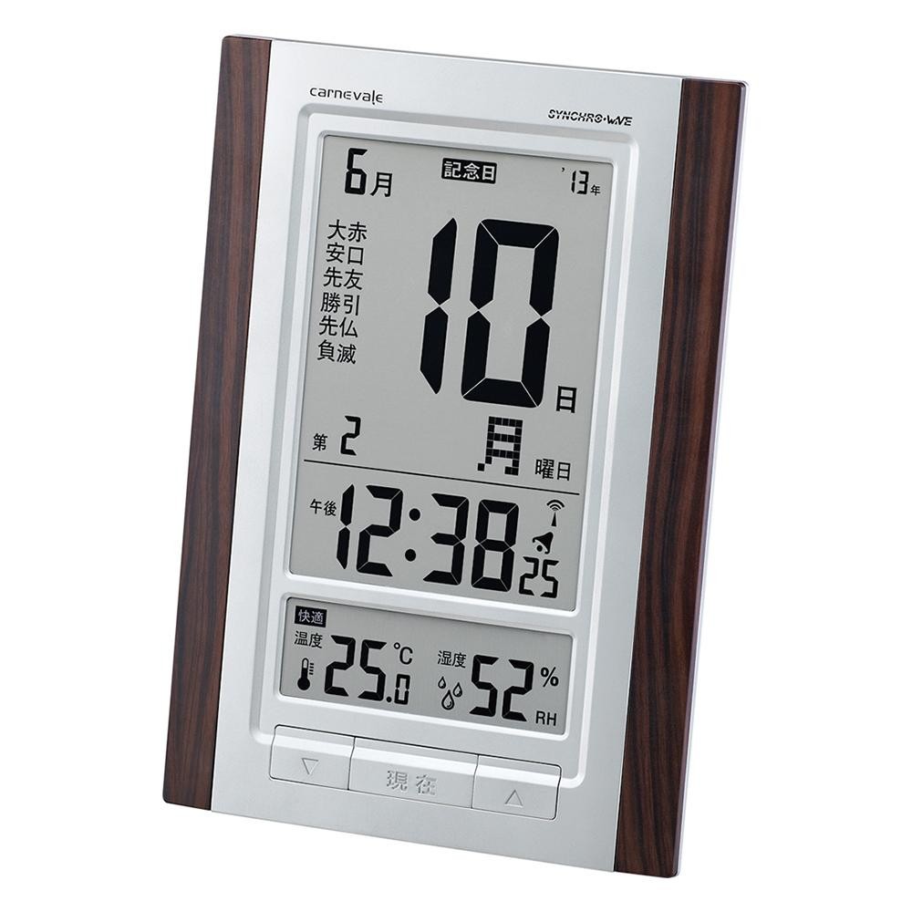 時刻を自動で修正する電波時計。温度と湿度のバランスからお部屋の環境を4つのマークで表示する「エアサーチ機能」付き!!六曜・第何曜日が表示されており、記念日表示設定機能も付いています。設置場所に困らない置き掛け両用!! |