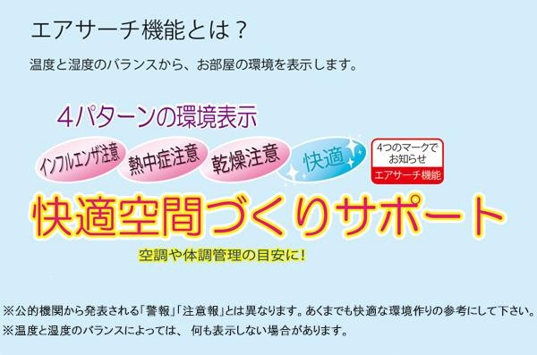 | 時刻を自動で修正する電波時計。温度と湿度のバランスからお部屋の環境を4つのマークで表示する「エアサーチ機能」付き!!六曜・第何曜日が表示されており、記念日表示設定機能も付いています。設置場所に困らない置き掛け両用!! |