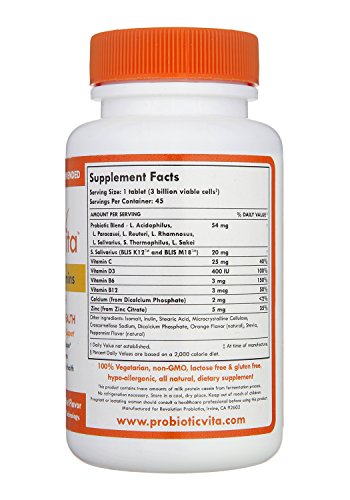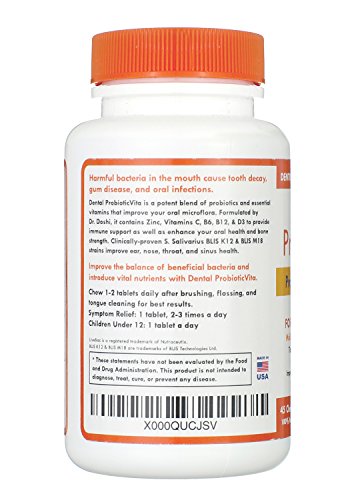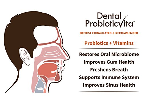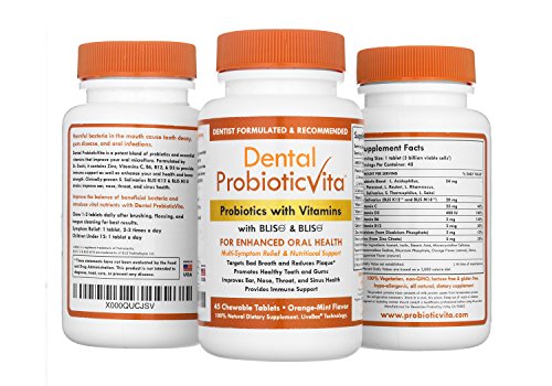 - Feature : UNIQUE FORMULATION MADE FOR BEST RESULTS • An innovative blend of naturally-occurring probiotics and vital nutrients, Dental ProbioticVita restores oral bacterial balance in the mouth and nourishes teeth & gums. It improves sinus and throat health with help of S. Salivarius BLIS strains. / BENEFITS & SYMPTOM RELIEF • Dental ProbioticVita improves your oral hygiene and reduces undesirable dental symptoms like halitosis, plaque buildup, tongue coating, dry mouth, and staining. It builds immune support to help prevent conditions such as gum disease, tooth decay, and canker sores. / DENTIST FORMULATED AND RECOMMENDED DAILY • Ideal addition to your everyday dental routine to improve and maintain great oral health. Trusted and developed by dentists and hygienists. Scientifically researched and proven to benefit all age groups, including children. / ENJOY THE REFRESHING TASTE • Sugar-free tablet with amazing natural orange-peppermint flavor. Quality ingredients to provide fresh breath and maximum long-term benefits. Chewable tablet dissolves in the mouth to immediately begin balancing your oral environment. / DISCOVER THE SCIENCE OF DENTAL PROBIOTICS WITH VITAMINS • Introducing probiotics in your mouth helps the beneficial strains to rapidly colonize and actively compete with bad bacteria. This unique blend provides nutrition to oral structures such as teeth, tongue, and skin inside the mouth. Restored and repopulated microbial population is naturally balanced in favor of better fresher breath, improved dental, sinus, and throat health.