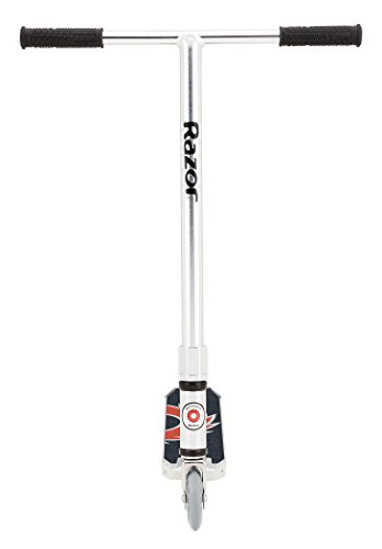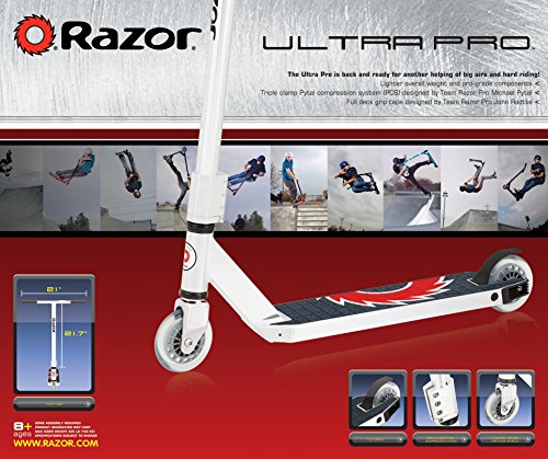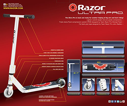 -. Feature : The Ultra Pro is back and ready for another helping of big air and hard riding / High-performance scooter designed by Team Razor Pro Riders / Features: Anodized, aircraft-grade aluminum frame with rigid down tube, fixed T-bar handlebars, and new rear comfort sP.R.Ing brake / New triple clamp Pytel Compression System (PCS) designed by our Team Razor Pro Rider Michael Pytel / Updated 14-spoke, 100 mm urethane wheels and full deck grip tape, artwork designed by Team Razor Pro John Radtke