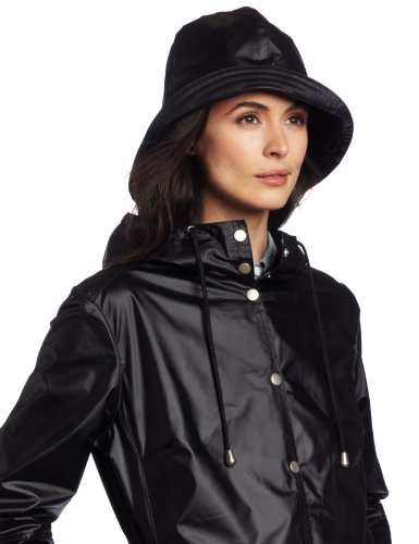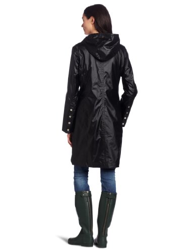 Waterproof jacket featuring zip front with snap-button flap, long sleeves with four-button cuffs, and hood with drawstring