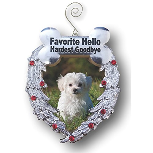 - FAVORITE HELLO HARDEST GOODBYE. Heart shaped angel wings Christmas ornament. Perfect keepsake ornament for the loss of your furry friend. Beautiful dog bone at the top of the heart that is engraved with the loving pet saying “favorite hello, hardest goodbye”.