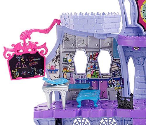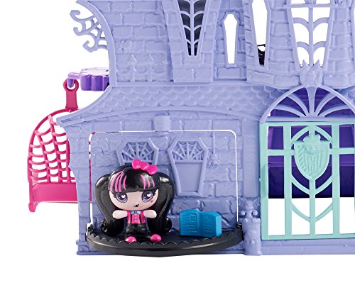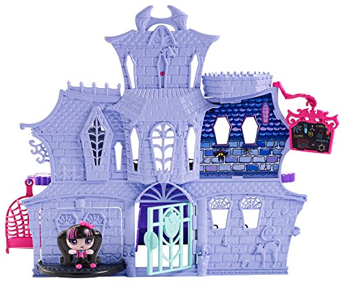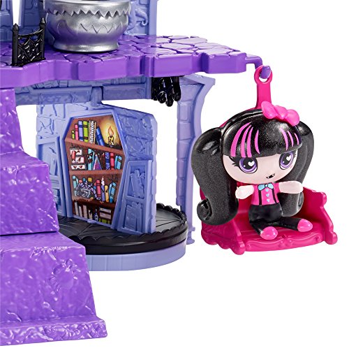 Studio : Mattel Publisher : Mattel Binding : Toy Product Description Enter the house of Dracula with this cool castle play set that comes with a Draculaura mini. Three floors offer colorful design, iconic elements and fun surprises. On the first-floor, young ghouls can lift up the lid in the kitchen to reveal monster food or "magically" move a mini using the bookcase in the library. On the second floor, a pull of the flush handle on the toilet in the second-floor bathroom pops up the lid and knocks the mini off. Draculaura mini's bedroom hides on the third floor. Open the clock to let her sleep hanging upside down; when the clock face is closed, the bat pops out. Other fun elements include a mini swing on the first floor, a study room on the second and a rooftop deck on the turret. 0