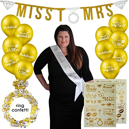 -. Title : Bachelorette Party Decorations Kit - Bridal Shower Supplies - Bride To Be Sash, Miss to Mrs Banner, Gold Bride Tribe Tattoos, Classy Table Confetti and Balloons