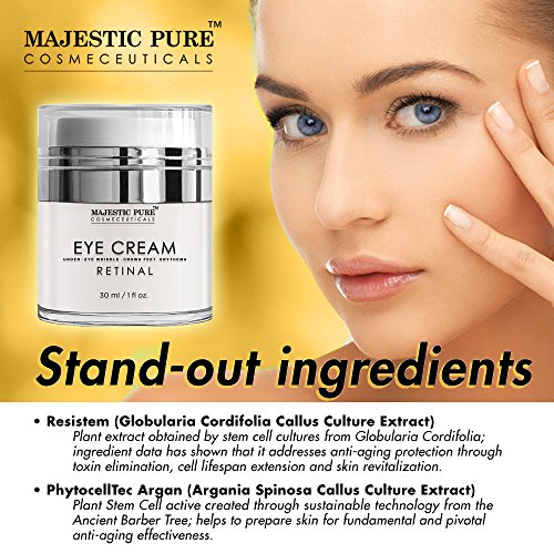 -. Feature : Majestic Pure Retinal 0.1 Eye Cream; youthful formula hydrates skin and helps recapture a youthful appearance, combats the signs of aging and reduces the appearance of under eye wrinkles, crow feet, dark circles, puffiness and hyperpigmentation / Retina - known for providing the ultimate anti aging properties to skin while being gentle Vitamin A making it perfect for all skin types. Resistem - Plant extract obtained by stem cell cultures from Globularia Cordifolia; ingredient data has shown that it supports anti aging through toxin reduction and skin revitalization; PhytocellTec Argan Plant Stem Cell active helps to prepare skin for fundamental and important anti aging effectiveness / SAFETY WARNING: For external use only. Rub a very small amount on the inside of your elbow area to test for any allergic reaction before use. Avoid contact with eyes, keep out of the reach of children. If pregnant, consult with your health care provider before use. / Use small amount and re apply as needed; the cream is yellow in color and has a light scent which dissipates over time / Majestic Pure Eye Cream with Retinal 0.1 is cruelty free and not tested on animals
