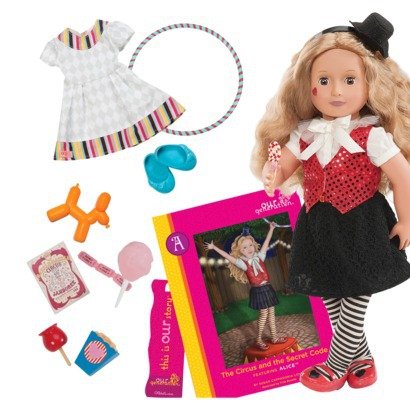 Studio : Maison Joseph Battat Publisher : Maison Joseph Battat Binding : Toy Product Description Your little "Our Generation" fan will love this Deluxe Alice Doll with Book. Alice is a talented acrobat. This 18" doll comes with 1 chapter book and 1 bookmark, 1 vest, 1 shirt, 1 belt, 1 skirt, 1 pair of tights, 1 pair of underwear, 1 top hat headband, 2 pair of shoes, 1 dress, 1 cotton candy, 1 balloon animal, 1 box of peanuts, 1 hula hoop, 1 lollipop, 1 candy apple, 1 playbill and 1 set of admission tickets. 0