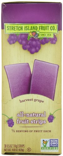 -. Feature : Pack of 30, 0.5-count strips of Stretch Island All Natural Harvest Grape Fruit Strips / 1/2 serving of real fruit per strip / Made exclusively with real fruit puree--no added sugar / No artificial flavors, preservatives, or colors / Convenient, take-anywhere, pre-wrapped strips of pure fruit