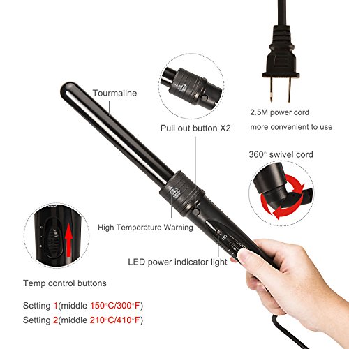 - EASY AND SAFE TO USE: ON/OFF switch with temperature control for easy handling. Just choose the suitable size barrel and switch it up, plug it into socket, The LED indicator is lighting when the curling iron turns on, and adjust the button to the temperature you need, then you ready to go!