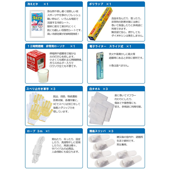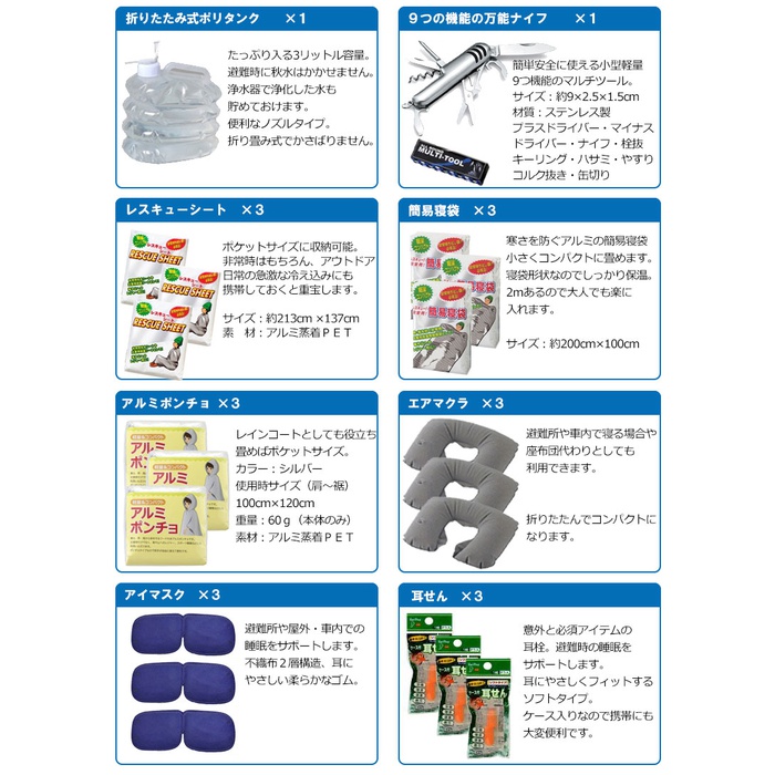 세트 내용 수량 특대 약40L배낭(7색에서 선택) 310년 보존 수【500ml】 9구출 라이스(미역3카레3pilaf3) 9 프리즈드라이(freezed dry) 비스켓 6로프3m 1 난연가공 방재 쿠션 3레져 블루 씨트 1반투명 쓰레기봉지45L(10매입) 112시간 연소비상용 로우 소《구》 1폴리 랩 1충전식 다이나《모라지오라이토》 1재해시용 응급처치 세트 1폴리 탱크3리터 1 한 번 쓰고 버려 슬리퍼 3LED21 등헤드라이트 1 포껌 테이프 1모리아《히토팟쿠》대 M사이즈 1모리아《히토팟쿠》가열 제 9긴급 간이 화장실1회용 남녀 겸용 9 구출 씨트 3 구출 간이 침낭 3알루미늄 판초 3 제균Wet 티슈 1수에 흘려 보내는 페이퍼 3 한 번 쓰고 버려 붙이는 카이로 9마스크(5매 셋트) 3만능 나이프 1트래블용 에어 베개 3 케이스 첨부이 선 3 칫솔 세트 「일본제」 9 긴급한 볼일 whistle 1 아이마스《구》 3 전자 라이터 1 삼각건 1목장갑(《스베리》지 첨부(부)) 3 단4전지4개조 1 백타올 3유성 마커 굵다/세트윈 검정 1 차가와져《피타》어른용2매입 1
