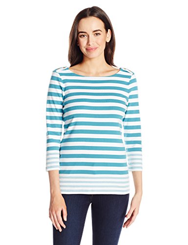 Gold buttons at the shoulder add a touch of shine to the essential striped boat neck tee. Cotton.