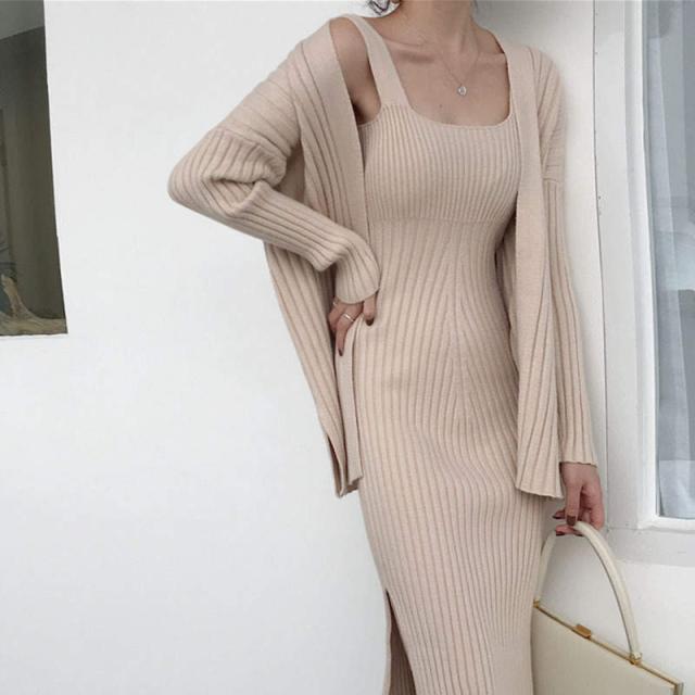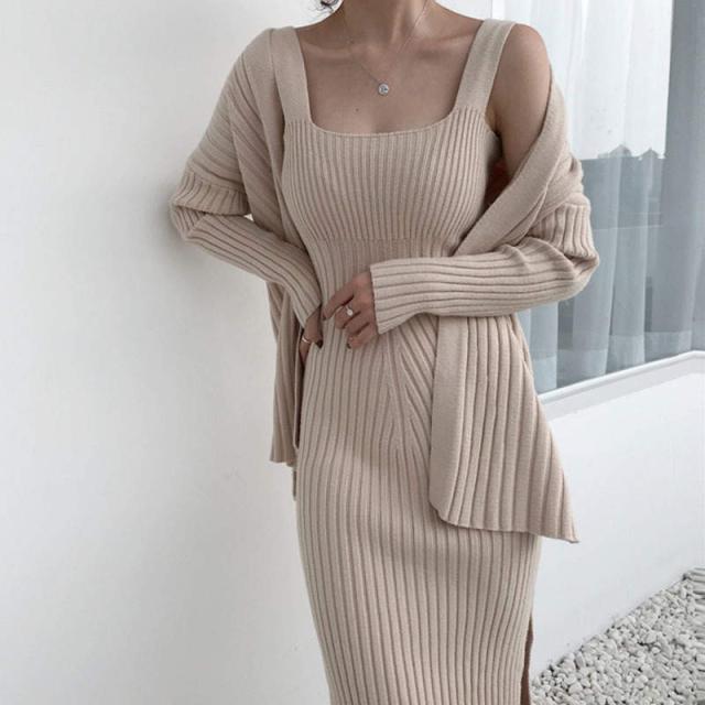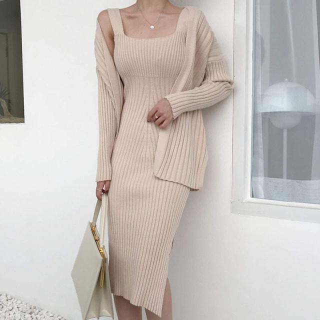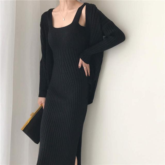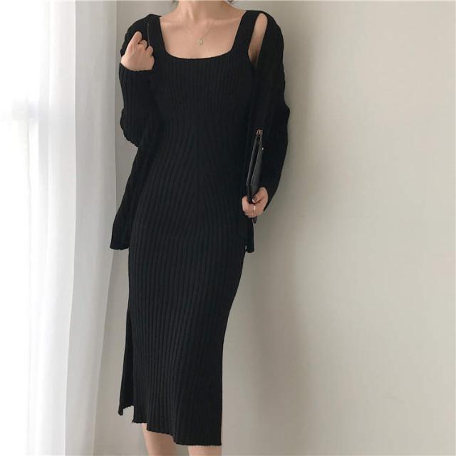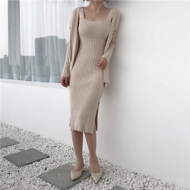 トレンド カーディガン デコルテ セットアップ ワンピース スリム スタイリッシュ 秋冬 上品 エレガント ワンサイズ