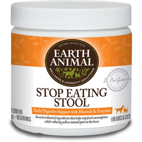 Earth Animal Stop Eating Stool Daily Digestive Support with Kelp and Cranberry is an active blend of ingredients that stop fecal consumption while reducing lawn brown spots. A special blend of nutrients and minerals that help prevent stool-eating episodes. Helps diminish yellow staining/spots on the lawn and balance urine acidity. Supports a healthy bladder. ingredients include cold water kelp, dl-methionine, liver, dried whey, potassium gluconate, cranberry extract and yucca schidigera. Mixed powder into food. Fine for prolonged use. MADE IN THE USA.