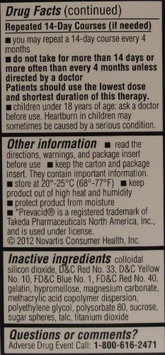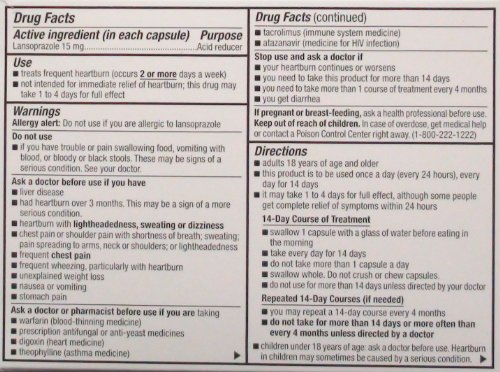 Studio : Rugby Laboratories Publisher : Rugby Laboratories Binding : Health and Beauty Product Description Count ?126 ?ea. Treats frequent heartburn Clinically proven Pharmacist recommended Clinically proven pharmacist recommended* Three 14-day courses of treatment Adults 18 years of age and older:? This product is to be used once a day (every 24 hours), every day for 14 days.? It may take 1 to 4 days for full effect, although some people get complete relief of symptoms within 24 hours.? 14-day course of treatment.? Swallow 1 capsule with a glass of water before eating in the morning.? Take every day for 14 days.? Do not take more than 1 capsule a day.? Swallow whole.? Do not crush or chew capsules.? Do not use for more than 14 days unless directed by your doctor.? Repeated 14-day courses (if needed).? You may repeat a 14-day course every 4 months.? Do not take for more than 14 days or more often than every 4 months unless directed by a doctor.? Children under 18 years of age:? Ask a doctor before use.? Heartburn in children may sometimes be caused by a serious condition.? Read the directions, warnings and package insert before use.? Keep the carton and package insert.? They contain important information.? Store at 20°-25°C (68°-77°F).? Keep product out of high heat and humidity.? Protect product from moisture. Active Ingredients: Lansoprazole USP15 mg 0