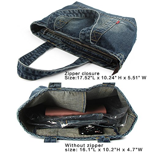 -. Feature : Well made and nice denim color- Soft and durable denim fabric and smooth zipper. And it does not have color fading problem. / Large capacity- A main zipper closure, two pockets inside and roomy for books, wallet, umbrella, water bottle, cell phone, cosmetic, and other daily things. Besides, specially design a hidden pocket on the left outside / It is lightweight and can be foldable. / Approx size-17.52"L x 10.24" H x 5.51" W, shoulder straps length: 10.24 in, width: 1.38 in Please note there might be 2-3% difference according to manual measurement. / It is practical and durable. Suitable for work, school, travel, shopping, and other occasions. Moreover, it is fashionable, and never out of season.