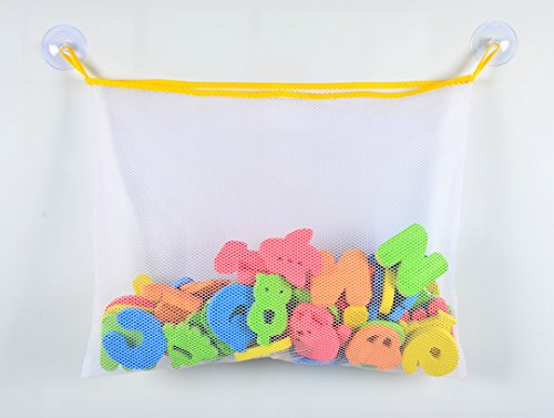 - 18in X 14in High Quality Polyester Toy Organizer Bag with 2 Strong Suction Cups is Included. The Suction is Very Strong on Tile, Mirror and Other Smooth Surface. Toy Organizer Keeps All the Shapes Well Organized Everytime.