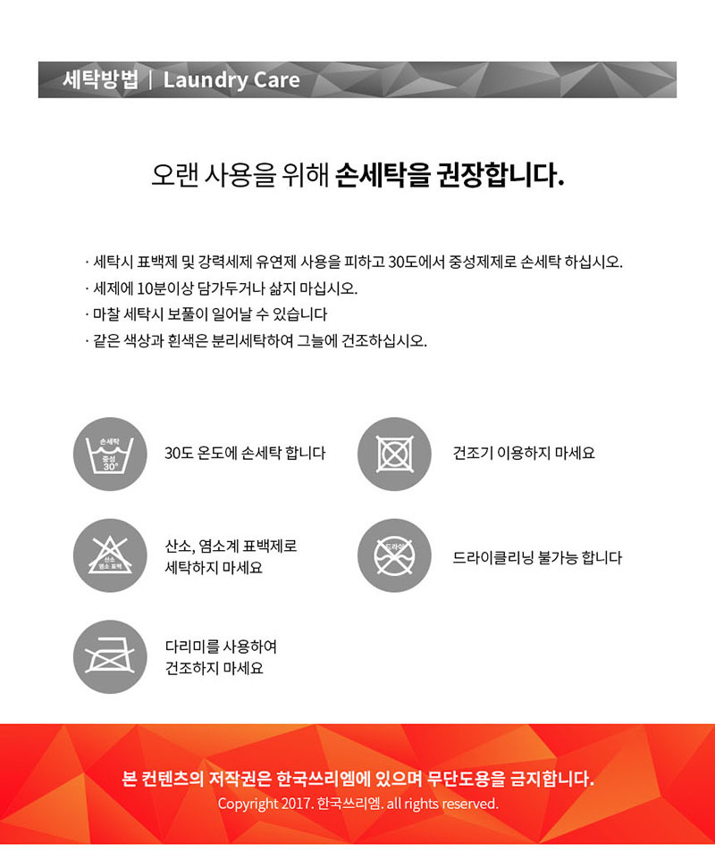 - Do not use bleaching agents, harsh detergents, softening agents while washing.